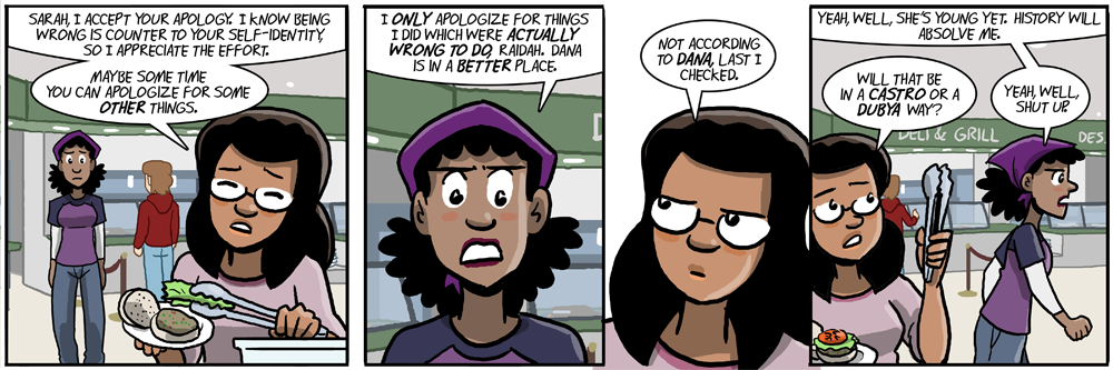 That wasn’t actually meant to be a defense of Sarah, but it’s still more like “This girl keeps harassing me about this, and then I sat down and explain the whole thing in detail to two other people even though I really didn’t want to, and then one of them threw it in my face and accused me of other shit that isn’t even true, and now I’m making myself apologize to the girl who was harassing me earlier and she still won’t let it drop for five minutes, and I don’t even care anymore, I am just DONE, okay?” (This is speculative of Sarah’s state of mind…but it sounds in-character to me.)