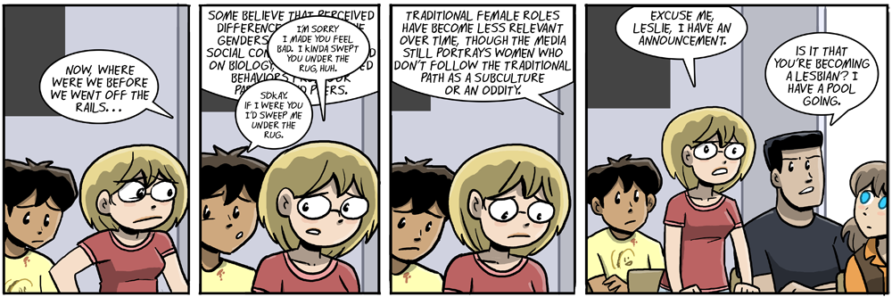 I know, right? No matter what she’s going to say, I feel like it would be less embarrassing for everyone involved to wait until after class. Also, poor Leslie. She’s just trying to teach her gender studies class.