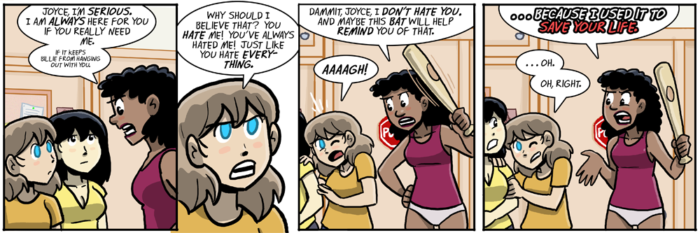 Sarah is a firm believer in tough love. Her only regret is that the bat isn’t metal to better simulate her love for Joyce