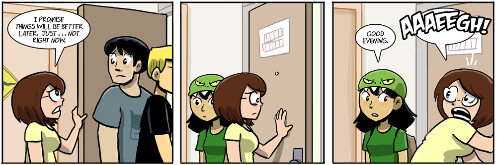 Looking back, they never actually looked behind the door. Mike only asked if they had. In subsequent strips, it’s clear that the door is still open. So, she could have been there behind the door THE ENTIRE TIME.