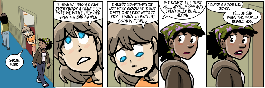 Sarah’s got it right, her being broken by the world will be sad, but Joyce is right to at least try new things.