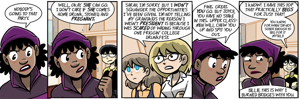 Waitwaitwait wait. There was a huge discussion a few strips back about how great it is that Roz is trying to make it acceptable for girls to have as much sex as they want. Now, when we have a girl who’s trying to have as much sex as she wants, it’s not acceptable. What gives, people?