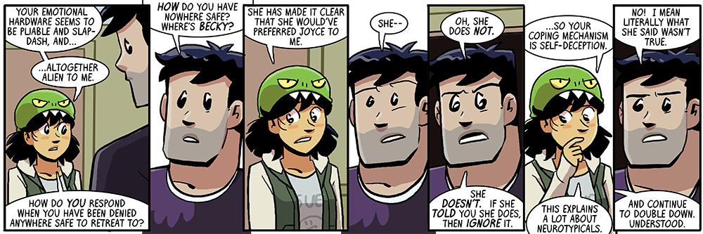 Let’s start out by saying I Hate New Things. If I could, I would’ve continued running the old site until I was a billion years old, held together by tape (both me and the site), finally beginning to write the characters’ sophomore year. But the old site was built on ComicPress, which is a WordPress plugin that doesn’t exist anymore. And the more it doesn’t exist, the more shit starts falling apart! AND IT WAS STILL WORKING, TECHNICALLY! Which I would bring up every time Kevin and Chuck would say, uh, hey, you need a new site built on something that currently exists and is supported. And I’d point out my right bottom wisdom tooth, which my dentist has been advising me remove for like five years now because it’s crumbling, it’s really just a clump of shards, BUT IT DOESN’T HURT YET, so until then I’m keeping it. (The dentist has given up asking me to remove it.)