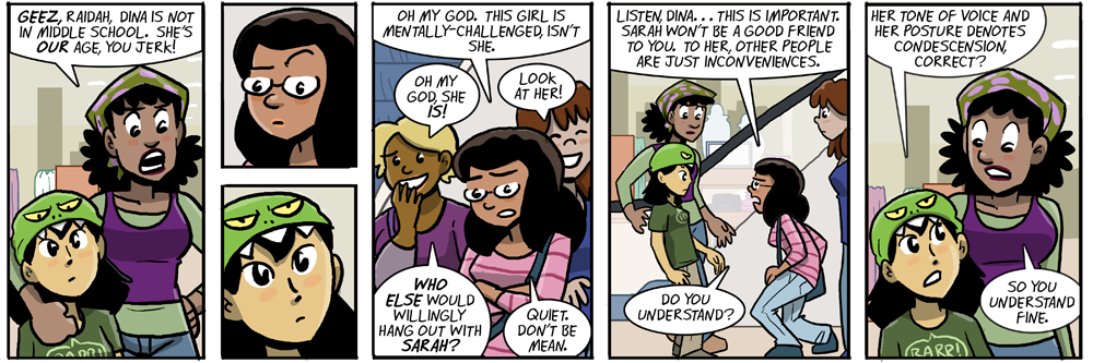 I gotta say, despite how rude Raidah is being in panel 5, she at least has the human decency to not laugh at someone she thinks is mentally-challenged. Yes, she is making a terrible, terrible assumption (and will hopefully pay the price for it) and is being condecending, but she’s not openly laughing and saying “Who else would willingly hang out with Sarah?”