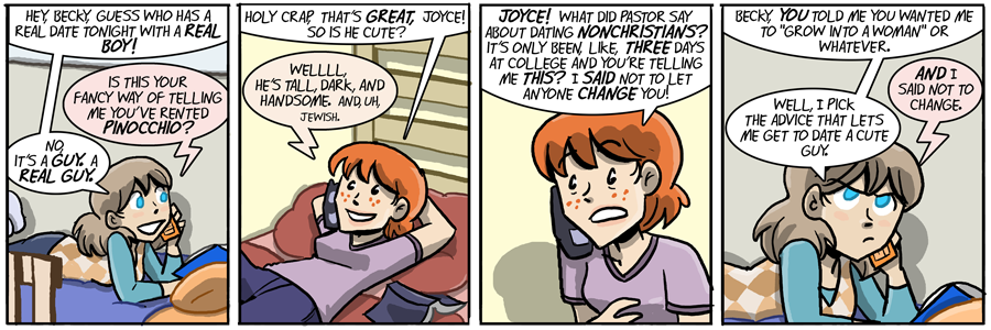 Two points. We’ll start with the boring one first. Joyce and Becky’s pastor does have a legit point – dating someone who doesn’t believe the same things you do, ESPECIALLY if the both of you have really strong religious convictions – can be a bed of thorns. It isn’t inherently bad, and can lead to a lot of very interest conversations and investigation of your own religion, but it is… rough. I say this out of experience.