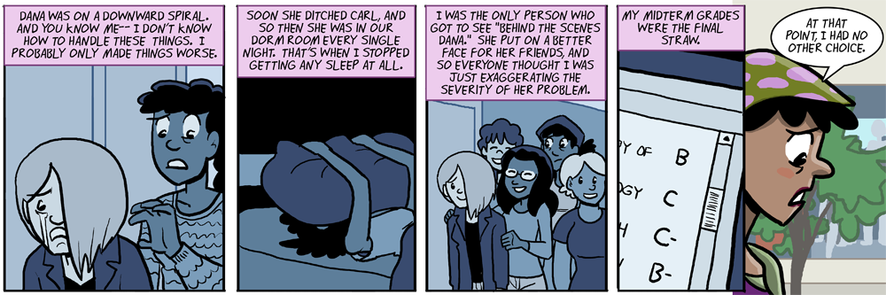 I don’t know. I keep envisioning this scenario where Sarah goes to switch roommate and they ask her why and she tries to make up stuff and they say it’s not good enough and then she just spills the beans accidentally getting Dana expelled. Good luck with that run-on.