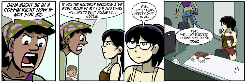 Seriously though (out of character here) I think we are worrying a bit much. Strangely enough, of the ways Joyce could have been exposed to “adult topics” this is less severe than it could have been. She could have been strapped down hard and forced to watch porn for hours until she wanted to destroy her brain or kill herself. The events at the party were horrible, but she is doing a decent job of being an adult, moving on and making connections within her social group for support and friendship. There will be ramifications, echoes if you will, of this event, but I don’t think they will lead to some climactic violent meltdown where people die or anything. So, you know, progress.