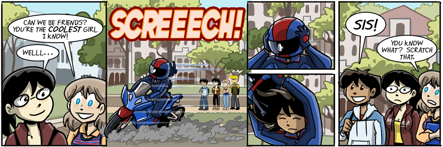 Since Sal ended up being the person who was on the motorcycle on page 5, does that mean that all that time we’ve been wondering where she was, she was just riding in circles around campus??