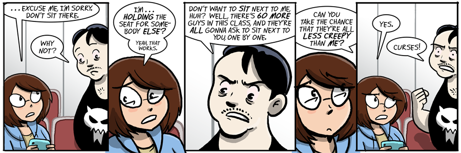 Oh, I get that shaggy’s not attractive. He’s not informed creepy though is the problem. This guy, for all his lack of creepy behavior prior to panel 3, has creepyness that can be inferred by the reader. Shaggy’s like a big lovable ugly puppy. Not gonna get the ladies with his hygiene or general unappealing habits, but no one’s gonna feel bad about sitting next to him. If anything he’d probably be better company than most.
