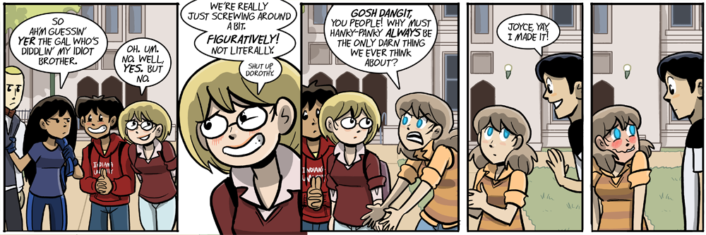 If Inner Joyce could be heard, she’d add to what Joyce said in the second panel: “I’m scared as shepherds about dealing with this all of this adult world sexuality and I need the real world to play along! C’mon!