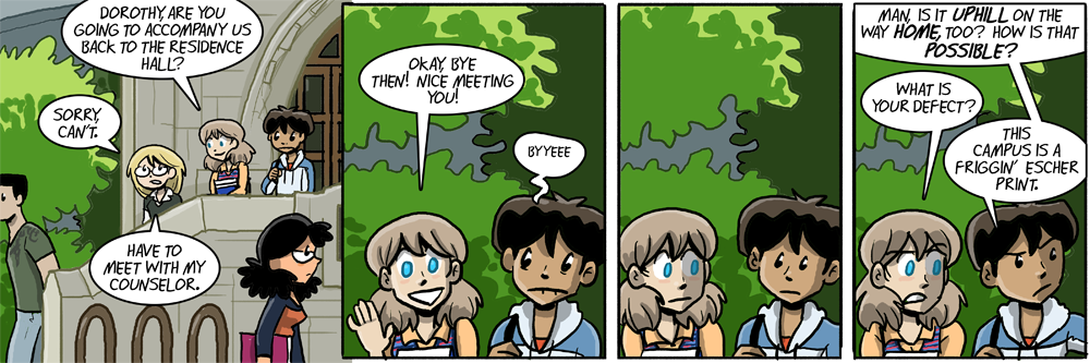I think all college campuses are designed using non-Euclidean geometry. We had a staircase we called the ‘M.C. Escher Memorial Staircase’ – it had an odd hidden switchback to it that meant it was about two flights longer than it looked like from the top or bottom.