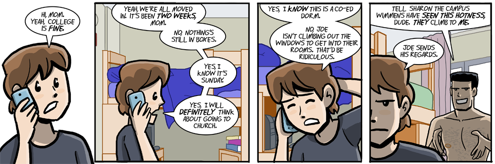 Nice shout out to the first Roomies strip. Danny’s mom can see other universes! Or she just knows Joe very well.