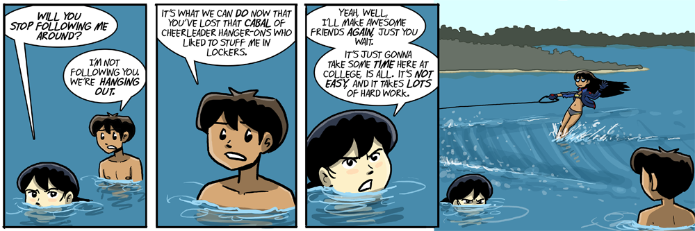 By the way… Sal could be waving to Billie or Walky or both in that last panel, but her face is turned more towards Billie. And her expression is disappointed that Billie is ignoring her. Conclusion: she was trying to impress Billie. And Billie is upset that Sal chose to go water-skiing instead of ‘hanging out’ with her – which seems a stretch until you remember that Billie and Sal were with each other a moment ago, so Billie may have been looking forward to spending time with Sal. This also relates to Billie’s earlier issues with Sal never being around.