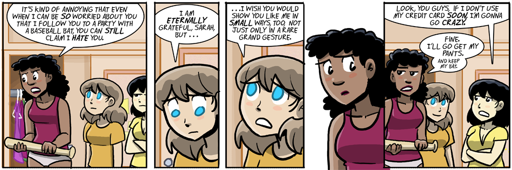 Hm… It’s interesting. The way she describes Sarah’s displays of affection/caring thus far, “… I wish you would show me you like me in small ways, too, not just only in some rare grand gesture,” fits pretty well as a description of how the Judeo-Christian God seems to work, no? Only appearing in rare, grand gestures.