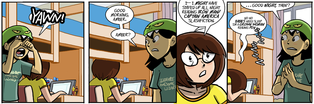 Dina understands the ways of staying up all night and reading slashfic. However, she does not know who this “I-ron Man” or “Cap-teen Amer-ee-kah” is. All she knows is Dinosaur/human slashfic.
