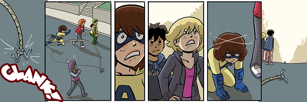 It’s also had a superhero doing superhero stunts and using superhero tropes practically as long. It lacks the Walkyverse’s aliens and powers, so it’s certainly more realistic in that sense, but it’s never been a strictly slice of college life strip.