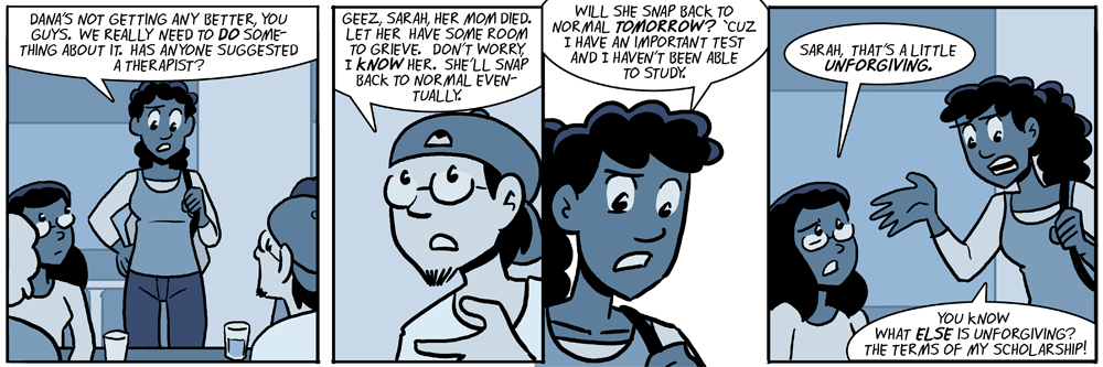 Sarah’s not covering herself in glory here, but it’s pretty clear there’s been a passage of time between this strip and yesterday and Dana’s been smoking most of it. “She’ll come round eventually, honest” is a pretty crap response (what if she doesn’t?).