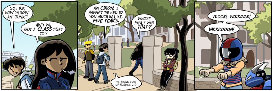I imagine Mike is nonplussed at the family drama — it’s a little much to learn about your roommate. Also, if Sal had been shipped off to a boarding school to curb wild tendencies, well, what if it HAD worked, and her addictions to nicotine and two wheeled performance vehicles were her only vices left? And postage hasn’t ridden much at all when you compare it to inflation (just ask my fountain pen penpalling friends — they’re hardcore!).