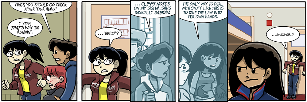 Check out the Amazi-Girl comics and imagine they’re being said by Christian Bale doing his Batman voice.