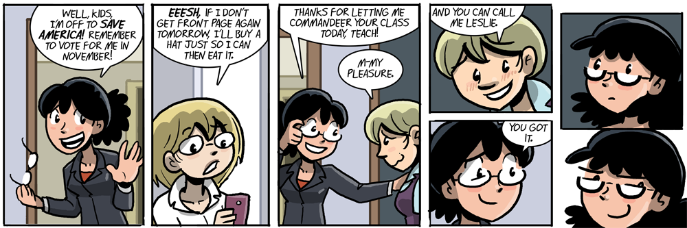 Interesting that even DOAverse Leslie has a crush on Robin, given that she doesn’t know her personally and probably only knows her public persona. And I have a sneaking suspicion that Robin’s policies aren’t the most gay-friendly out there.