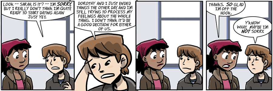 Now, if Shortpacked! Mike were Sarah in this position, I’d expect him (her?) to reply with ‘You know, at first I was going to turn you down’ and then grab Danny and start kissing. Using full-tongue action, of course.