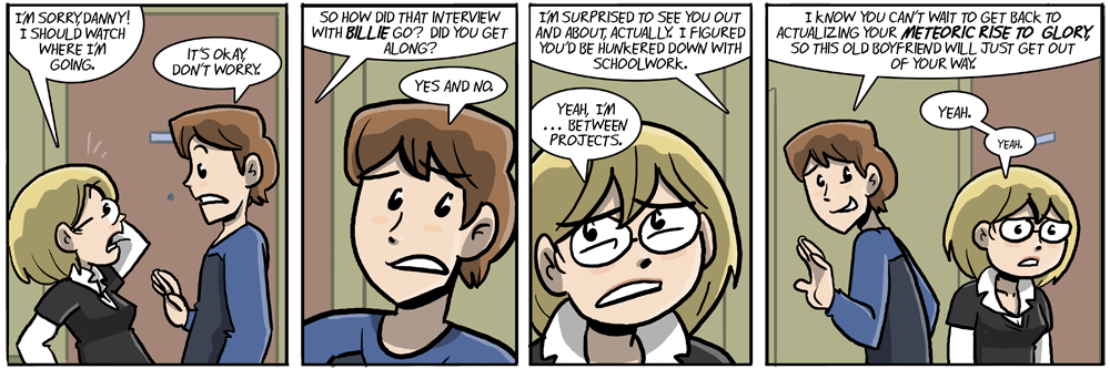 Well since this isn’t a sound comic we can’t just assume he is using some kind of sarcastic tone. Check the facial expression and remember who this character is. Danny isn’t a passive aggressive guy. If anything he is just still being a bit awkward around her. While the strip in which they broke up was over a year ago for us for them it has been maybe a week.
