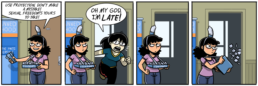 She’s just making sure that Billie won’t be late again. Still, I never could use a “free sample condom;” I’d be too worried some company was trying to get rid of their defective stock. Besides, not like you can take it back for a refund if it doesn’t work…