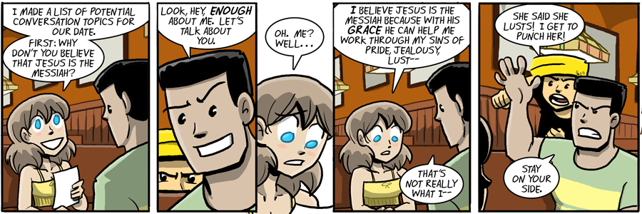 I honestly have to respect Joe’s commitment to this date. I’m pretty sure that if most people were on a date where the other person was either trying to convert them or force them to talk about topics I don’t feel comfortable discussing with someone they hardly even know… well, the date would be over rather quickly.