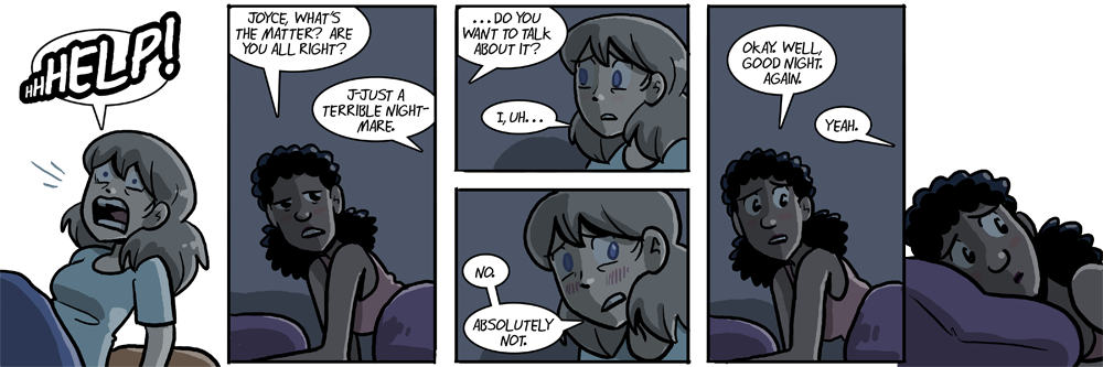 I suppose I put what’s going on together a little differently; it seems much more horrifying than the last strip. We all have bad dreams. but carrying that kind of trauma around and refusing to deal with it, possibly/probably because you’ve been told you’ll be taken care of if you live ‘correctly,’ is hell yawning to take you.