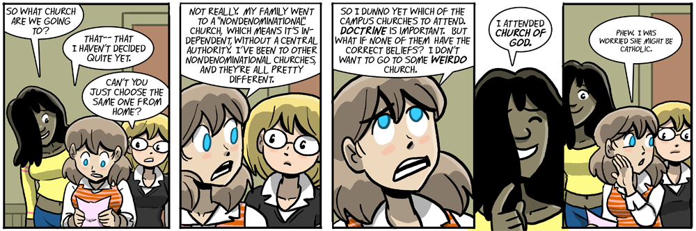He’s brought up eastern religions when Walky mentioned the power rangers: http://www.dumbingofage.com/2011/comic/book-1/04-the-bechdel-test/pray/