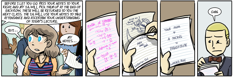 Gah, I LOATHE it when my teachers do this. Why the fuck should I bother taking notes if you’re just going to take them? Might as well just… well, write what Mike did.