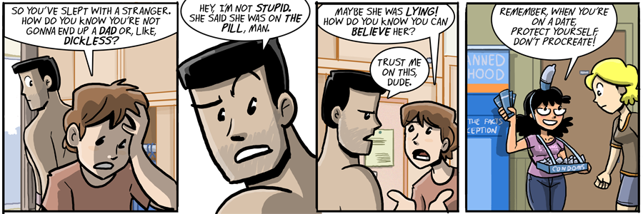 I think the point being made here was that she is an advocate of preventing pregnancy, and the handing out condoms is a way of doing this. If she is on the pill, she knows she is meeting her requirement, with or without the use of the condom. Yes, condoms will protect from STDs, but that’s not what she is advocating in the last panel.