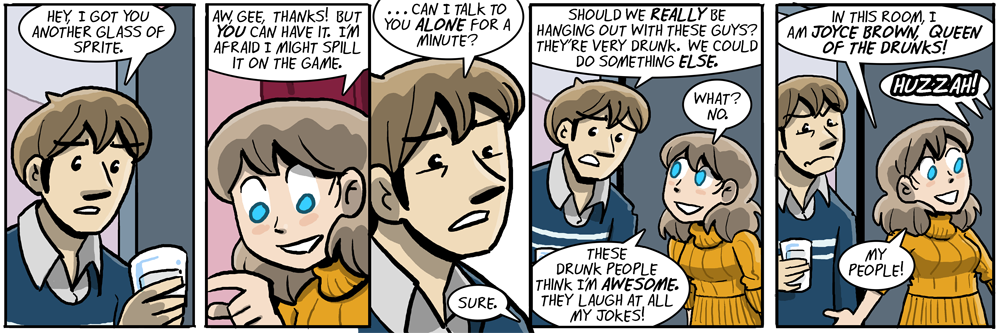 is the “these drunk people think i’m awesome” supposed to be said by him? it looks more like something she’d say considering the last panel