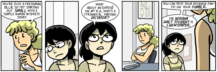It’s their third day. In that time, Billie has been harassed by Ruth on three separate occasions and physically hurt on two of them. I realize it often takes more than three days for someone to change, but with the pace this comic is going, I’m just afraid we’ll be stuck on kick-Billie mode for the next few years until comic time reaches the point where her shift can be realistic.