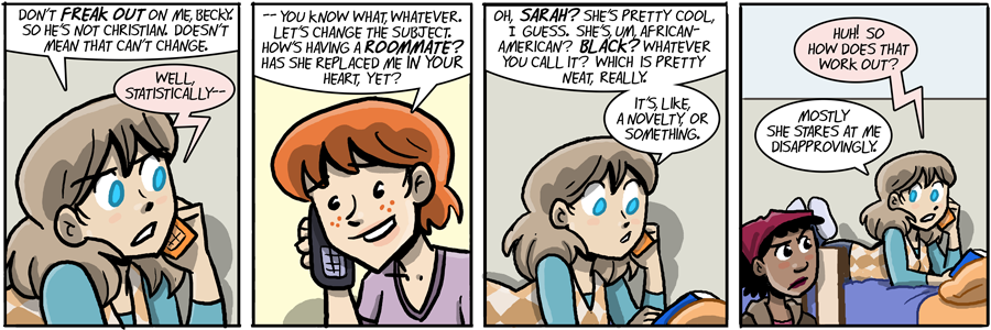 Sarah being black has not bothered Joyce in the comic. Racism by definition is either intolerance toward a specific racial group or the idea that color determines someone’s ability to achieve (i.e., whites will always be superior to blacks, or blacks will always be better athletes). Joyce has not done that here; she’s simply noted the racial difference between her and her roommate and notes that it’s a novelty *for her* to be living with some from a different racial group–which is the TRUTH since she’s obviously never had any kind of relationship with somebody outside of her own background. So, in a private conversation with her best friend, she said something that obviously can be taken the wrong way.