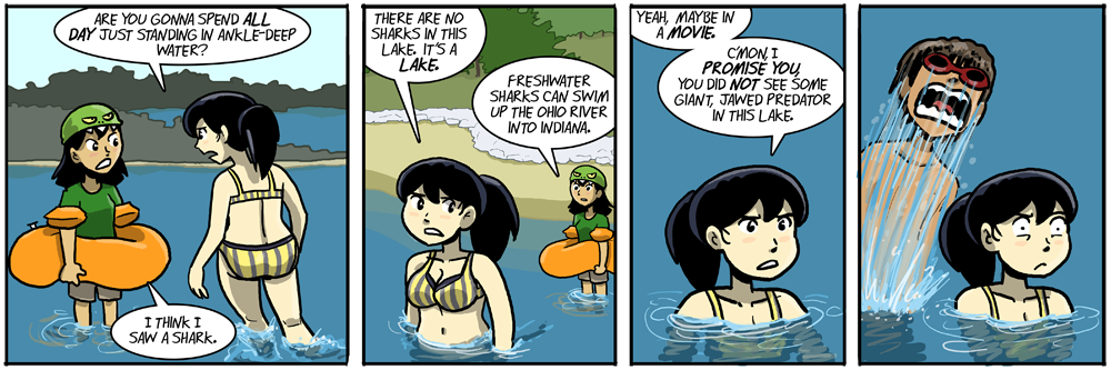 Hey. I’m gonna eat y’all. I’m gonna eat that hairy leg. I’m gonna eat that one, too. Oh, I can see right up them shorts! I got a whole bunch of rows of teeth to chew you with. duun dun, duun dun duun dun…Oh, now wait a minute. I did have a chubby kid on a raft earlier today. It’s okay, though. I’ve been swimmin’ a lot lately. Mmm, yummy. Mmm