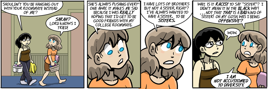 She is, but I don’t think this is an example of it. I think Joyce came to college with the understanding that Racism Is Wrong. She just doesn’t understand the protocol for dealing with these strange, alien creatures known as African-Americans.