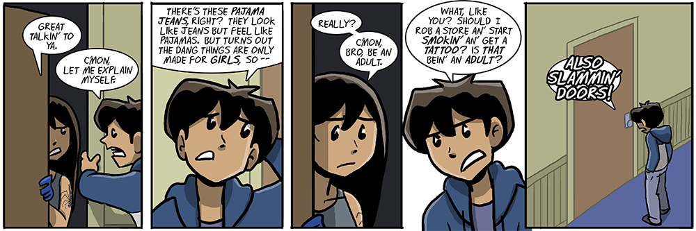 Why would he feel defeat and rejection from Sal slamming the door on him? She’s his sister – not only is this probably the ten-thousanth time, which would take the edge off, but they’re too young for him to really care about her opinion anyway.