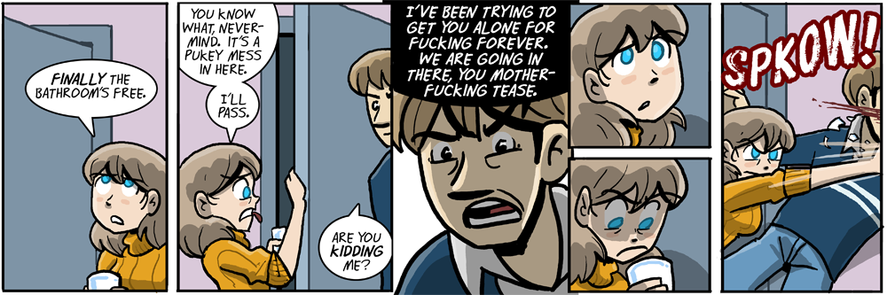 I originally drew this strip to be more violent, but changed my mind and toned it down. However, after lots of discussion on Twitter, that original version is now what you see here. For more about the thought behind the change to and fro, check this Tumblr entry.