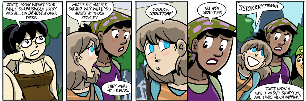 She’s referring to the time before storytime, so, panel 2. That’s her happy face.