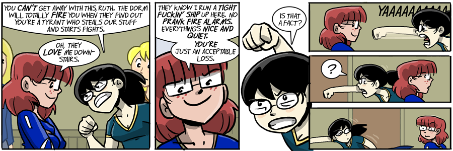 Anyone can SAY the people in charge love them… especially since that threat keeps people from actually putting in any complaints about them. If people actually said ‘hey this bongo steals our crap and beats us up’, the college board would HAVE to do something, lack of prank fire alarms be damned. Billie should just effing TRY it. Especially since Ruth is now *gasp* late in turning in all her RA paper work. They can’t be loving her so much right now.