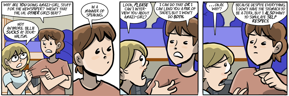 How? No action Dorothy has made thus far has taken any parties into consideration. Danny can be hardly blamed, here. Let’s look at both options 1) shoes: She doesn’t really owe Walky anything — they were both screwing around, and the solution she’s taken to mend the situation was a dick-move. If given the circumstance, putting my recent ex in an uncomfortable situation to help myself get out of a quick jam would be off the table. She tried to get Danny’s shoes through Joe without permission, and given that has failed, she’s taking advantage of Danny’s good nature to get the shoes anyway. Option 2) – the story: Amazi-Girl isn’t even her assigned job. She’s planning to take Billie’s beat (setting competence aside). She deserves neither her story nor his shoes.