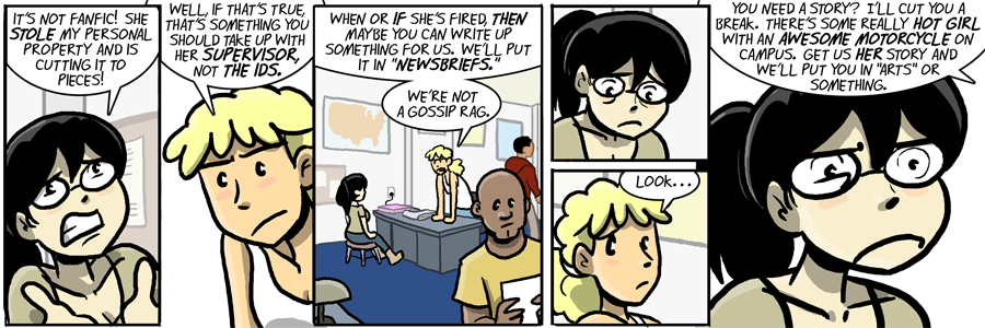 This is totally believable seeing as how college newspapers suck out loud. Still, she should be admonishing Billie to deliver evidence or proof of some kind, not that the story is “not news worthy.” My school paper had amazing front page articles like, “It snowed yesterday, did you notice? Here are some pictures of people and snow.”