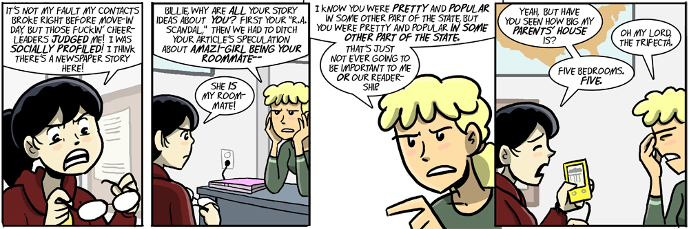 Yeah, I feel like on the usual college campus a corrupt RA would be big enough news. Of course, most college campuses don’t have a political sex scandal or a local superhero to write stories about, so I suppose next to that Daisy can afford to ignore RA scandal stories as too boring.