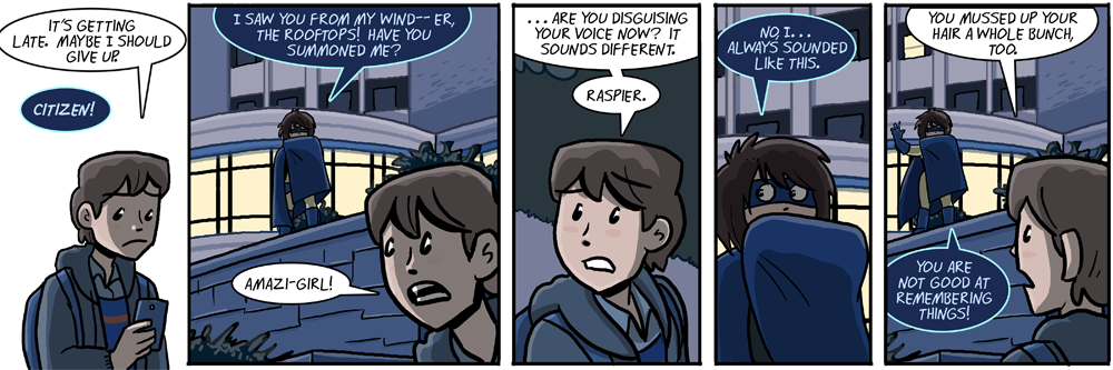 I just realized something. If this Amazi-Girl’s color scheme is reversed then maybe she isn’t immune to criticism like her Shortpacked doppleganger. Not that Danny is criticizing her on purpose, but his attention to detail certainly has her off guard.