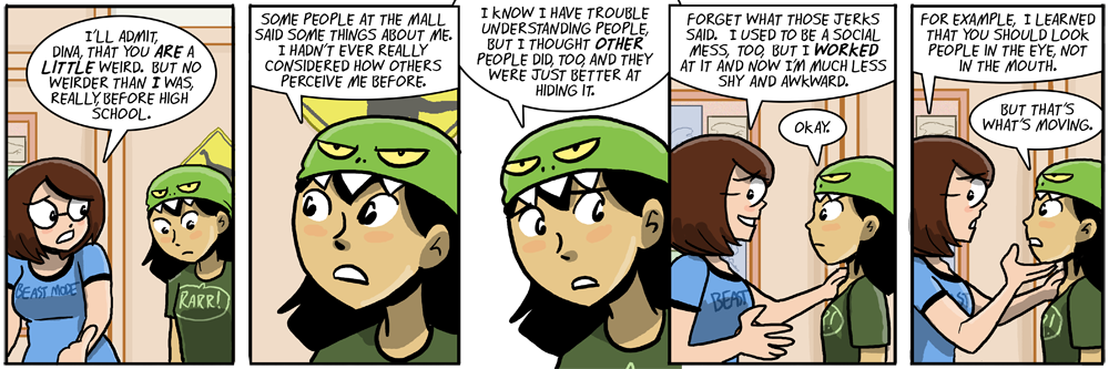 Now, Japan has different rules for eye contact, and some of you folks may recall that Dina is of Japanese descent. But she has also lived her entire life in America (as has her parents), so this behavior is unrelated.