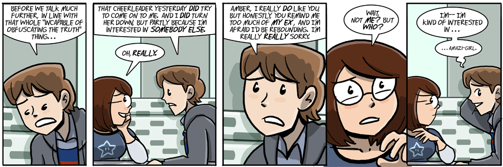 It only seems so easy to guess because we, as the readers, can make near-instant comparisons between the two (Amber and Amazi-Girl). The fact that the two are never in the same place is actually a powerful defense, especially since Amber is a shut-in nerd. Nobody expects her to be around in a situation like that, and without having the two in the same place (or else someone to take pictures of Amazi-Girl), there’s literally no way for anyone to make an accurate comparison.